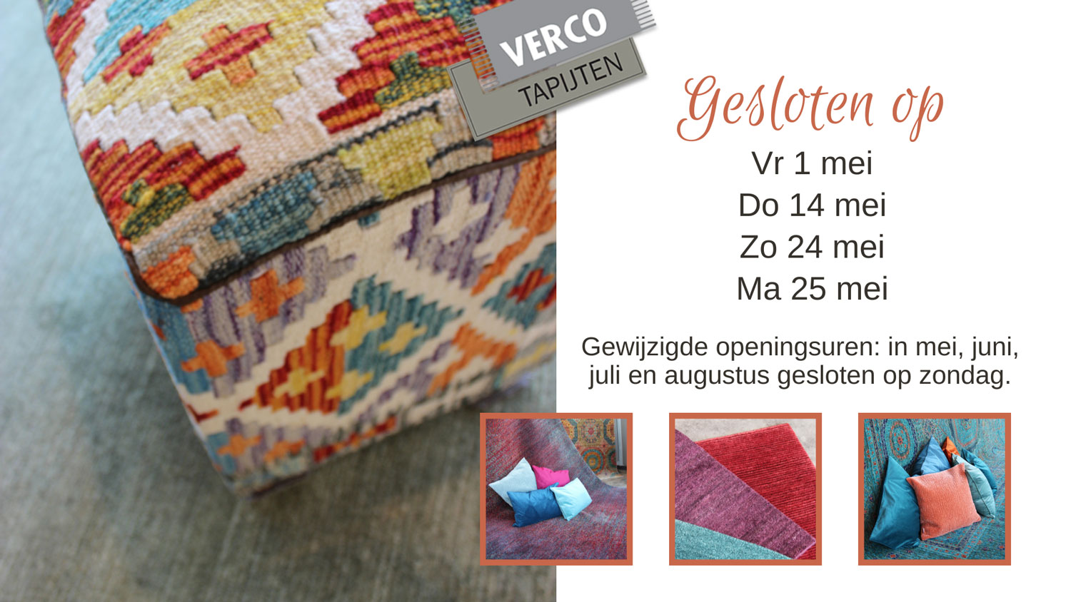 "Bedankt voor de info , wij genieten dagelijks van ons mooi tapijt en als mensen ons vragen vanwaar het tapijt komt …..VERCO in Hamme natuurlijk!!!! Groetjes."